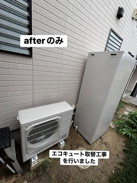 こんにちは、でん助です。今回は、エコキュートの取替工事を行いました。今回はパナソニックのエコキュートを取り付けさせていただきました。雨が降ったりやんだりして服などがびしょぬれになりながら作業を行い、工事が完了しました。