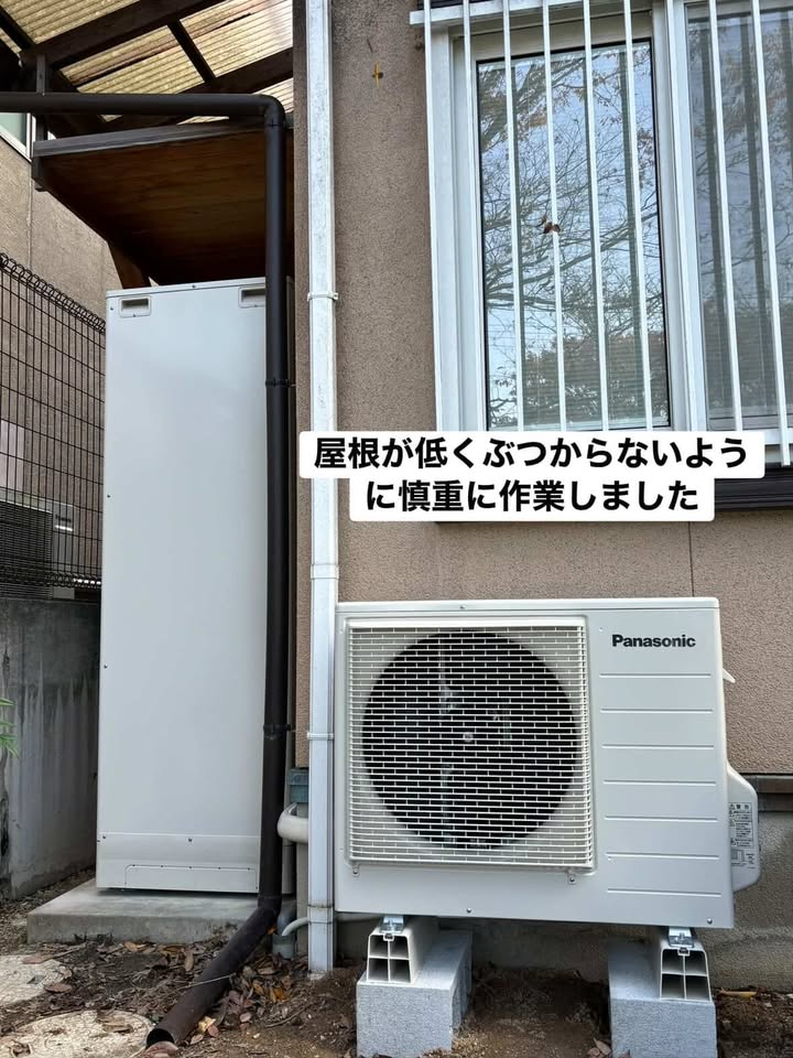 こんにちは、でん助です。今回は、エコキュートの取替させていただきました。設置場所の屋根がギリギリで撤去す作業と設置する際にもぶつからないように慎重に作業を行いました。